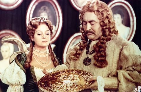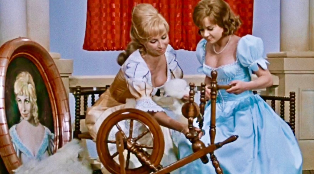 Nimmt man das Spinnrad als Symbol des Fleißes, den der König frevelhaft missachtet, erscheint der Fluch nicht mehr als ein willkürlicher, sondern folgerichtig und einleuchtend. Und die Reaktion der Fee ist uns Menschen nur allzu verständlich. „Auch einer Fee muss zubilligenüber Ungerechtigkeit und Dummheit empört zu sein und zornig zu reagieren“, hält Walter Beck der Märchenfigur zugute. So sehen es auch die anderen Feen. Der weitere Verlauf des Märchens bleibt in der DEFA-Adaption erhalten. Die zwölfte Fee verwendet ihren noch offenen Wunsch darauf, den Tod der Prinzessin in einen hundertjährigen Schlaf umzuwandeln. Und mit ihr alles Leben im Schloss, damit sie nicht mutterseelenallein ist, wenn sie erwacht. Besorgt um das Leben seiner Tochter – sein Eigennutz ist erkennbar – erlässt der König den rigiden Befehl, alle Spindeln im Land zu konfiszieren und zu verbrennen. Zuwiderhandlungen würden mit dem Tode bestraft. Es ist ihm gleichgültig, dass er damit all jene um ihren Broterwerb bringt, die Tag für Tag hart arbeitend am Spinnrad sitzen.