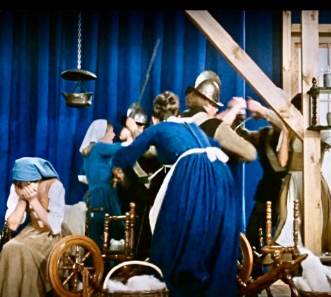 Die Fabel spricht nicht davon, auch sonst keine bislang bekannte Version des Märchens beschreibt die katastrophalen Folgen des königlichen Befehls für das Volk. Walter Becks Inszenierung bereichert an dieser Stelle das Märchen um einen grundlegenden gesellschaftlichen Aspekt. Er nimmt die Arbeitswelt auf, macht Sorgen und Nöte des Volkes sichtbar, und bringt damit Herrschafts-und Besitzverhältnisse ins Spiel, die über die einfache Polarisierung von arm und reich in Märchen hinausgehen. In den Spinnstuben ringen die Frauen mit den Soldaten, die ihnen ihre Spindeln entreißen. Sie wehren sich mit aller Macht.