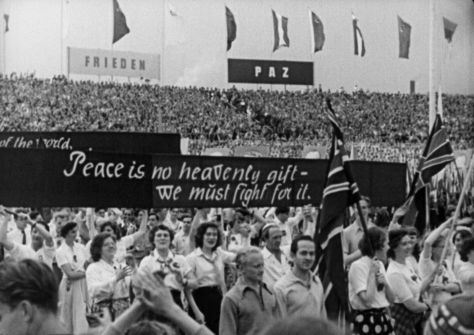 Die Jugend der Welt zu Gast in der DDR-Hauptstadt. Kundgebung im Berliner Stadion der Weltjugend im August 1951 Filmfoto aus Dokumentarfilm „Freundschaft siegt“ © DEFA-Stiftung/Mongolowskaja/Sokolnikow/Browin