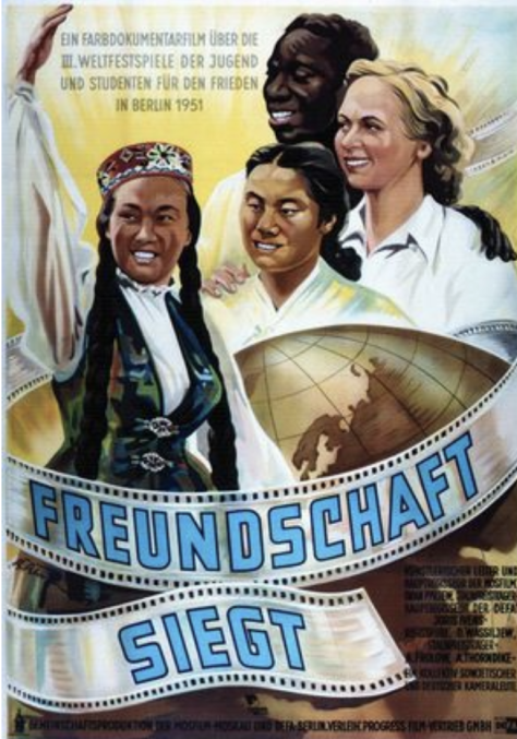 Das Filmplakat für den Dokumentarfilm „Freundschaft siegt“ über die III. Weltfestspiele der Jugend und Studenten, die vom 5. bis 19. August 1951 zum ersten Mal in Berlin stattfanden. Grafik: B. Petersen © DEFA-Stiftung