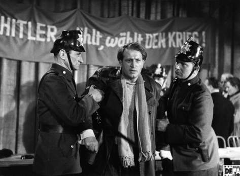 „Stärker als die Nacht“ wurde 1954 von Regisseur Slatan Dudow gedreht. Walter Beck fungiert dabei als Erster Regie-Assistent. Wilhelm Koch-Hooge (M) verkörpert den Kommunisten Hans Löning. Er wird nach der Machtergreifung der Nazis 1933 verhaftet und kommt für sieben Jahre ins KZ. Seine Frau Gerda bleibt ihm und ihren Idealen treu. Nach seiner Entlassung organisiert Hans erneut eine Widerstandsgruppe, die mit Rüstungs-Sabotage gegen den Krieg kämpft. Hans wird verraten und stirbt im KZ. © DEFA-Stiftung/Manfred Klawikowski, Gerhard Kowalewski