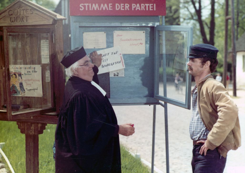 Das lag ganz im Sinne des Autors Rudi Strahl, dessen gleichnamiges Bühnenstück 1975 im Maxim Gorki Theater ein Publikumserfolg war. Die DEFA griff zu, und Regisseur Roland Oehme verfasste das Drehbuch für den 1976/77 produzierten Film unter Mitwirkung des Autors. Auf sehr komödiantische Weise trifft Kirche auf Partei – oder umgekehrt. Der Pastor sitzt in den Parteiversammlungen, der Parteisekretär sagt „Grüß Gott“. Ihre Info-Kästen für Mitteilungen an die Dorfbewohner stehen nebeneinander – auf Augenhöhe. Ein Schelm, wer Arges dabei denkt. Peter Reusse kannte das Bühnenstück übrigens nicht.