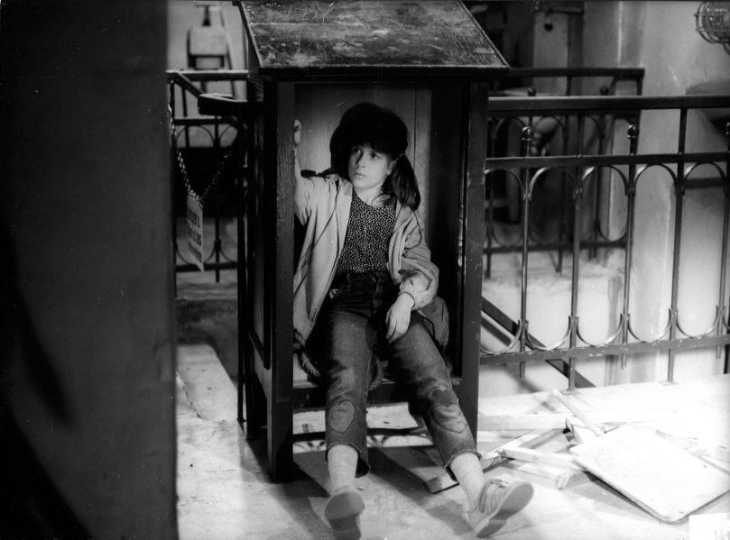 Carola soll einen Stuhl aus dem Keller holen. Weil der Hausmeister nicht da ist, setzt sie sich in das Rednerpult an der Treppe. Hierhin verzog sich Nicole in einer Drehpause und schlief ein ©DEFA-Stiftung/Siegfried Skoluda